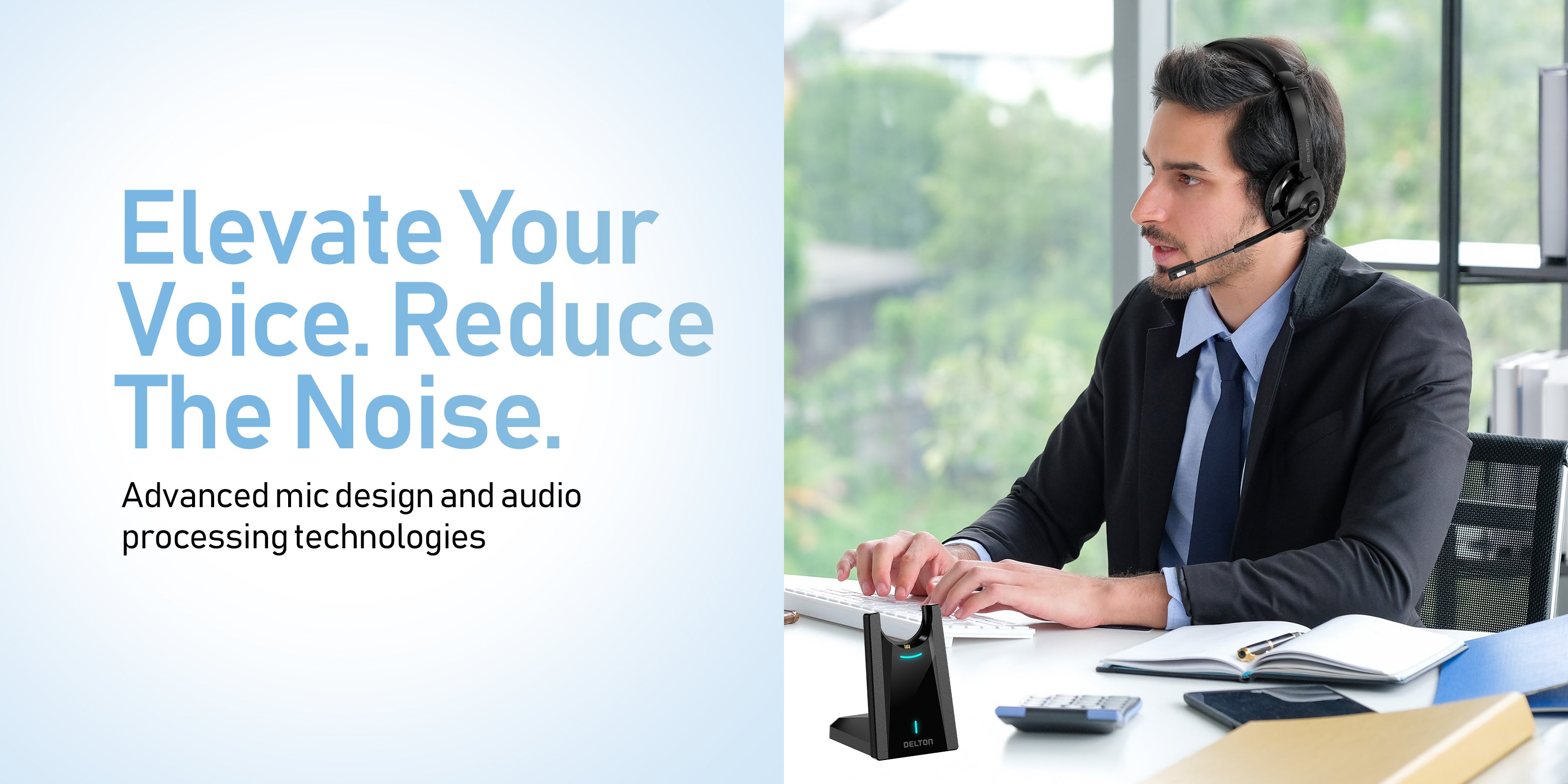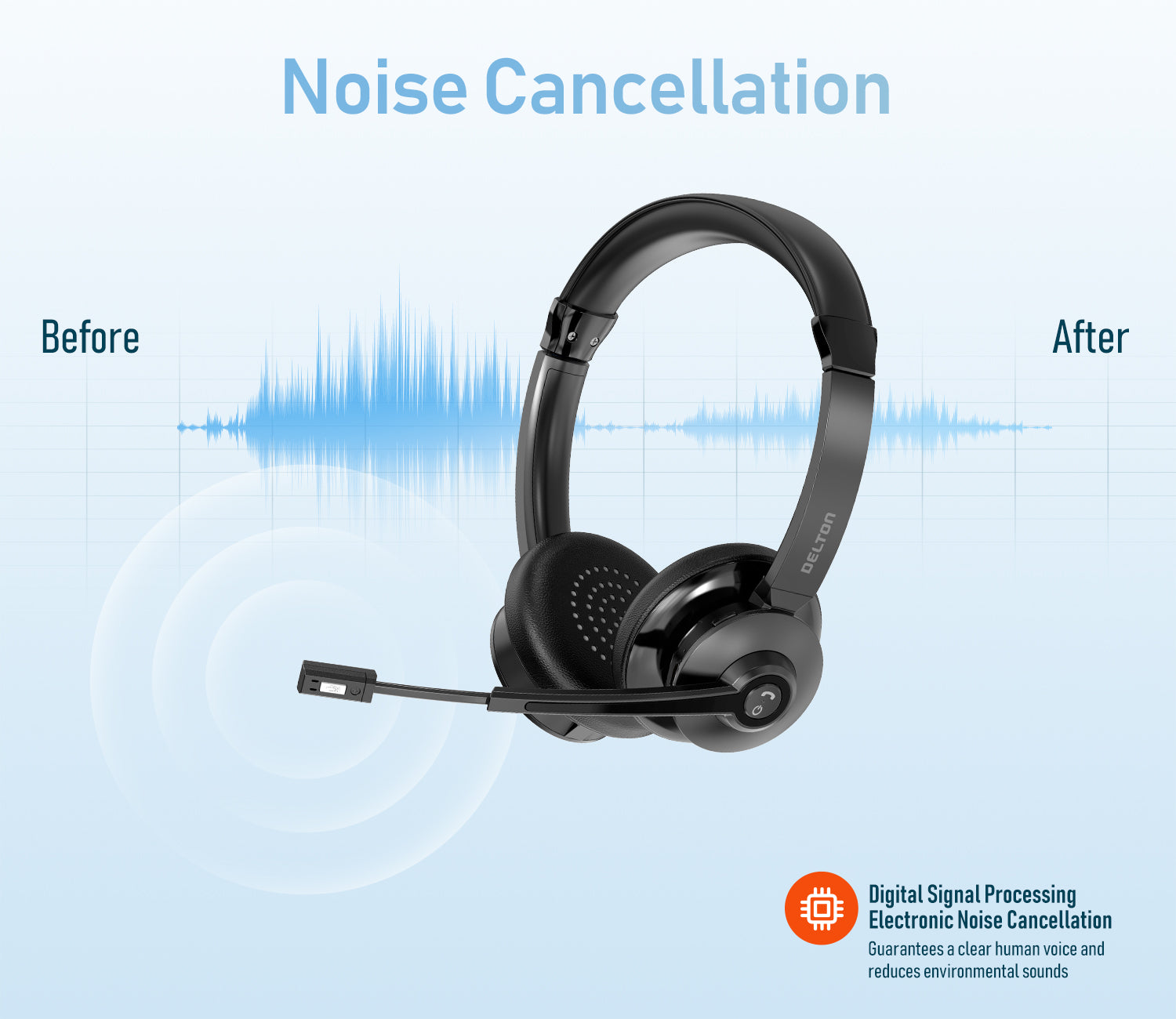 Introducing the Delton 35X Wireless Noise Cancelling 2-Ear Bluetooth Computer Headset, designed to meet all your communication needs, whether you're working from home, in the office or on the go. We have listened to your feedback and created an exceptional headset that offers a comfortable 2-ear fit with memory foam earpads, superior call quality, long-lasting battery life, and convenient features such as auto-pairing dongle and fast charging.