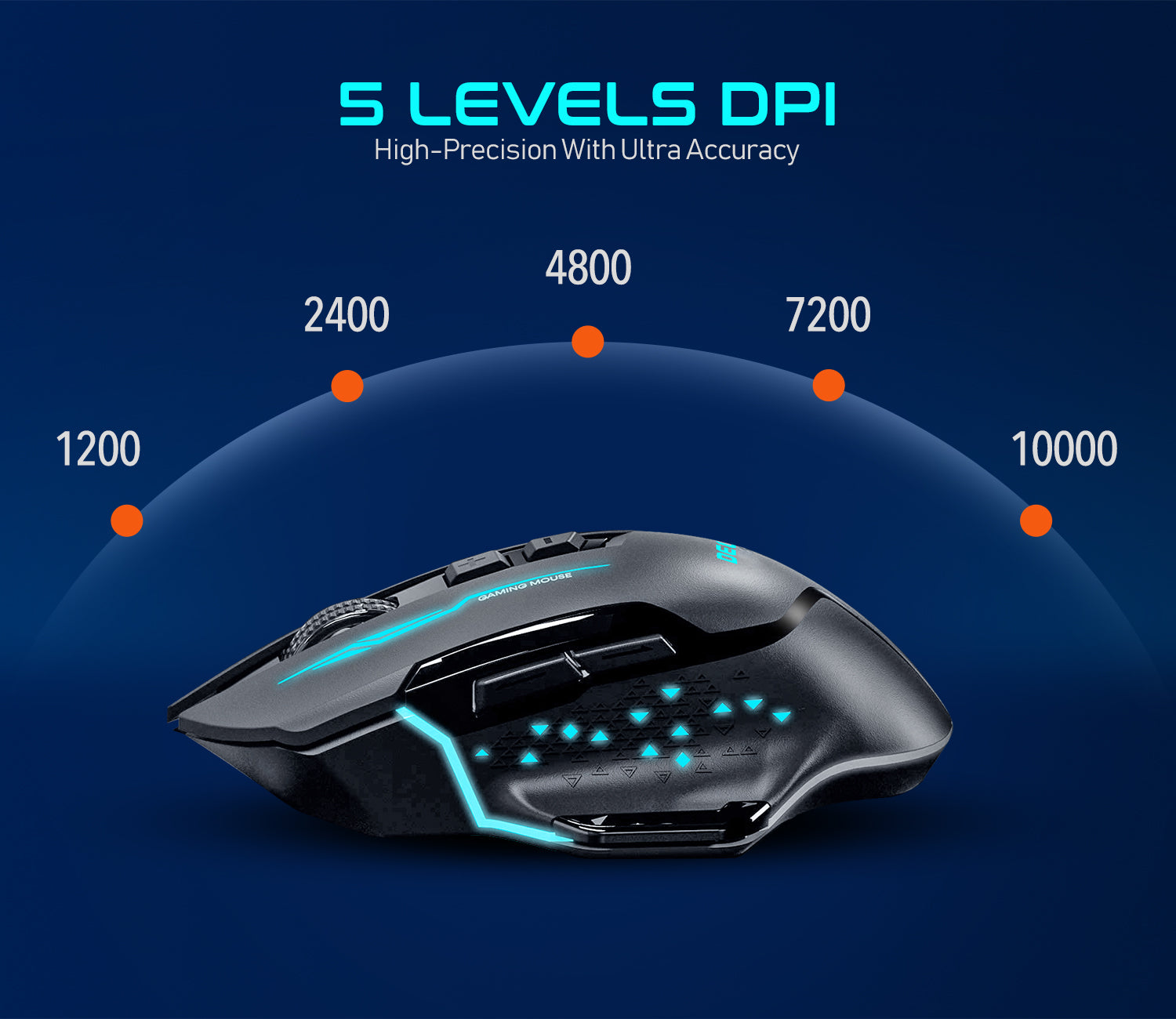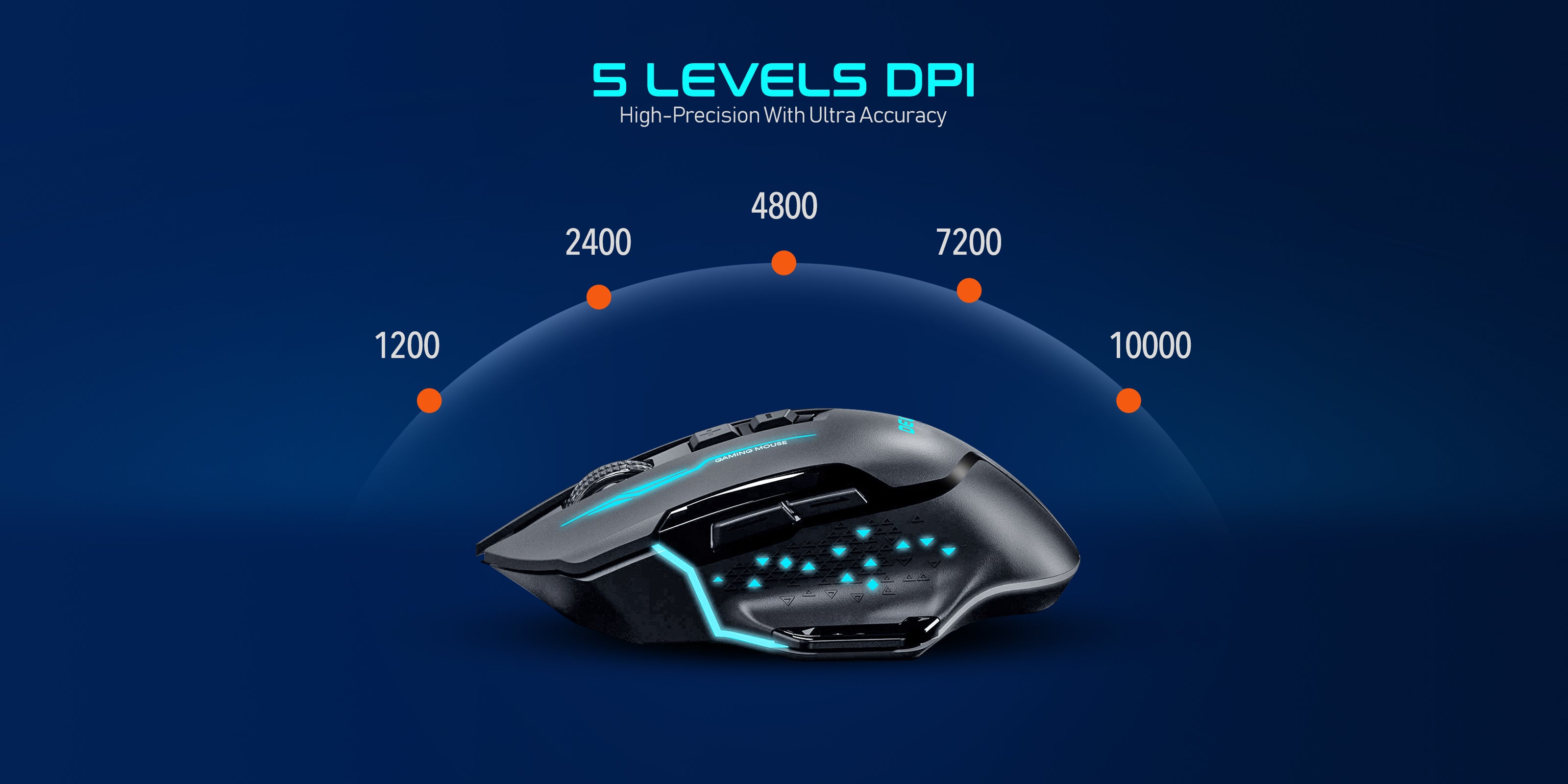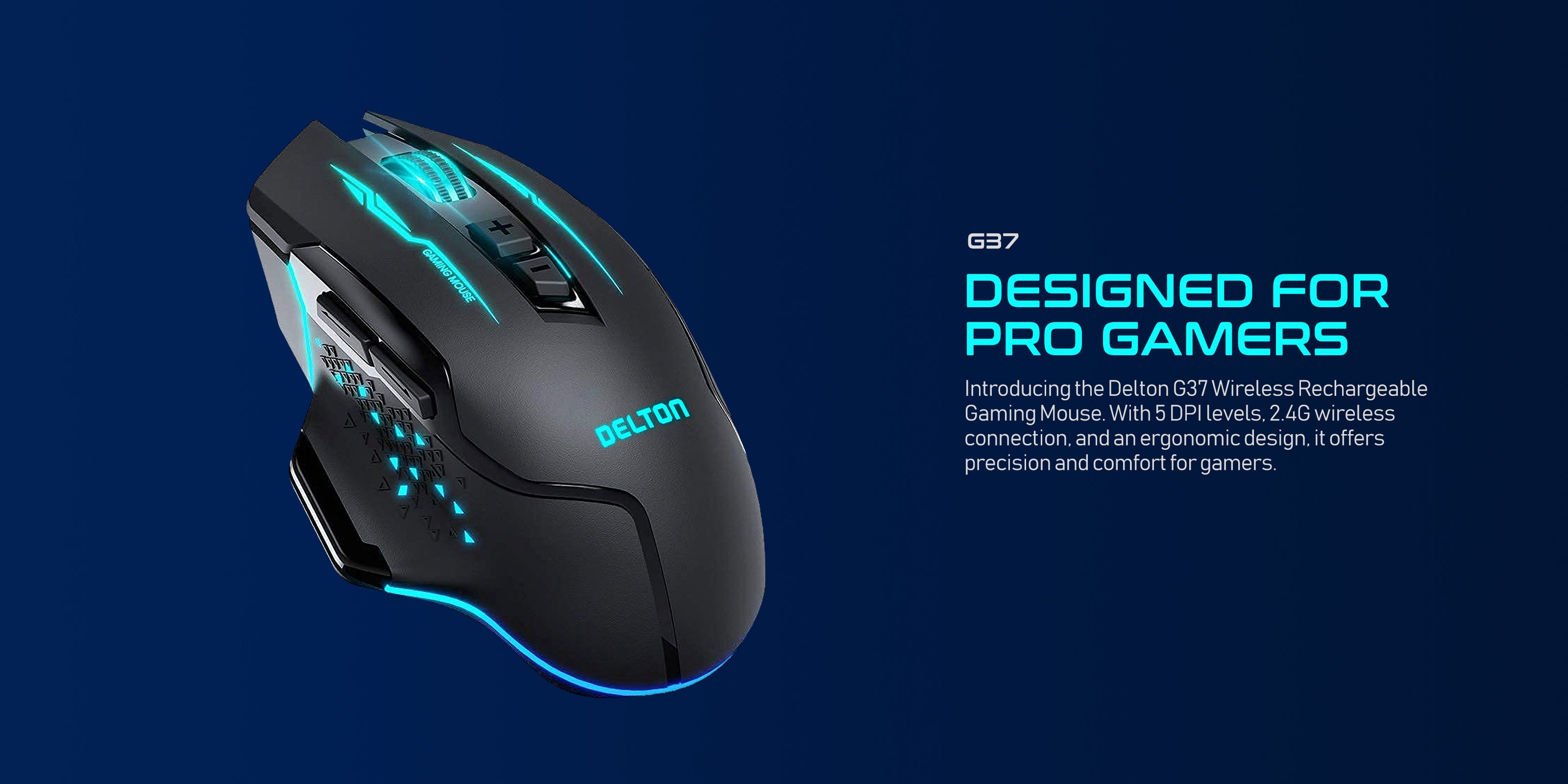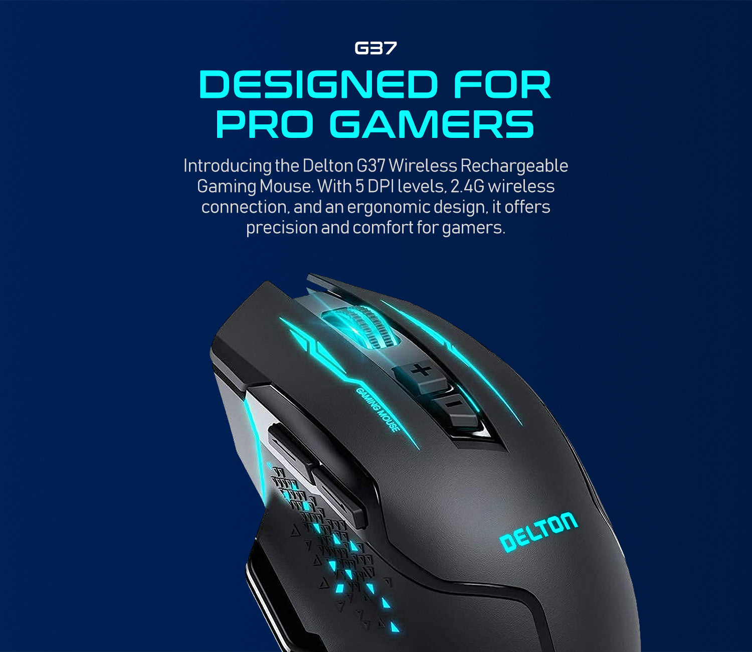 Introducing the Delton G37 Wireless Rechargeable Gaming Mouse. With 5 DPI levels, 2.4G wireless connection, and an ergonomic design, it offers precision and comfort for gamers.