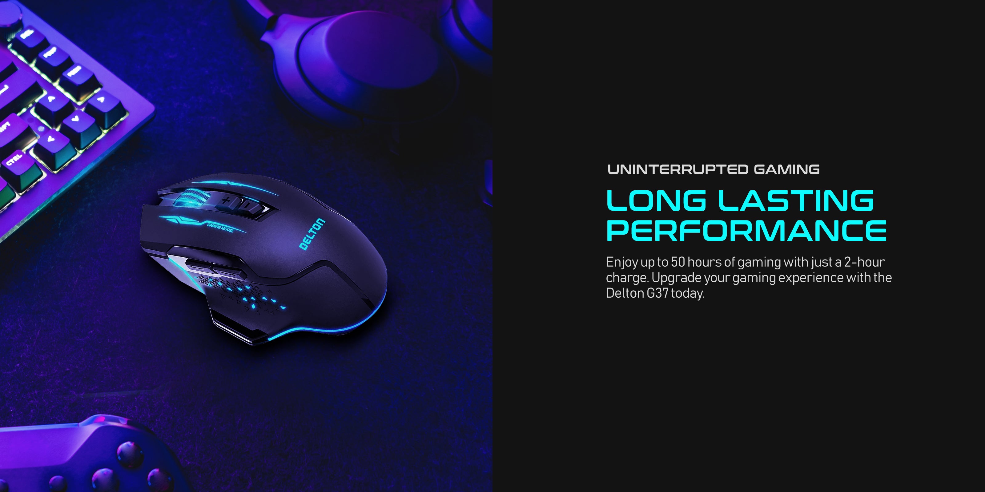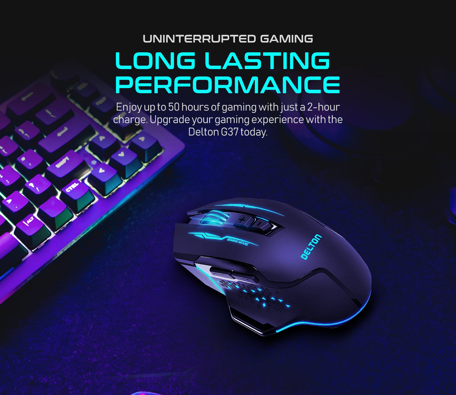 The auto pair USB dongle ensures easy setup, while the smooth scroll wheel and 6 buttons enhance control. Enjoy up to 50 hours of gaming with just a 2-hour charge. Upgrade your gaming experience with the Delton G37 today.