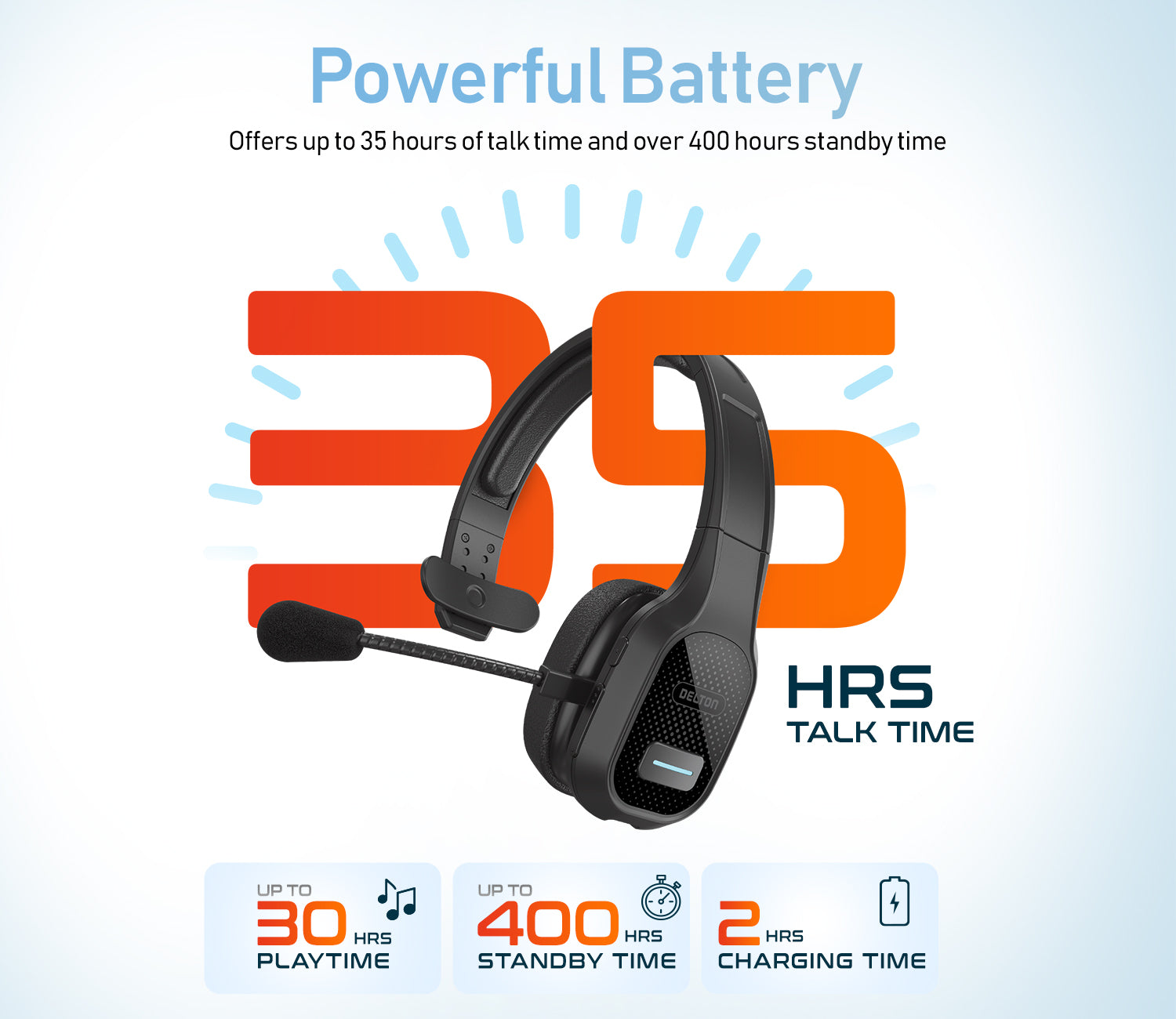 Designed to help your productivity. Delton enlisted office managers, and remote workers to help build a headset with all the features you need for all-day comfort, with a long-lasting battery, and a 3.5mm cable that lets you work even when the battery is dead.