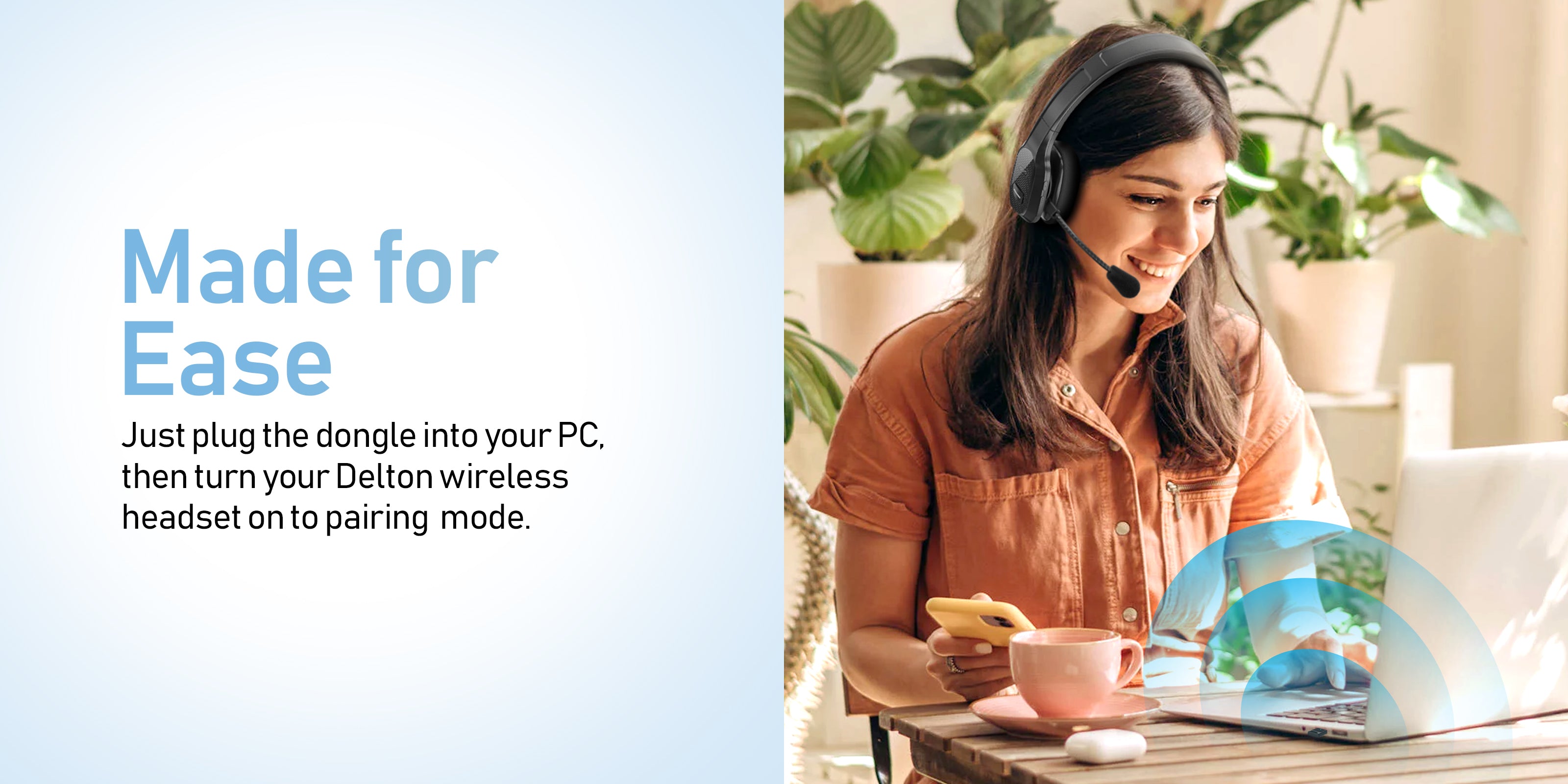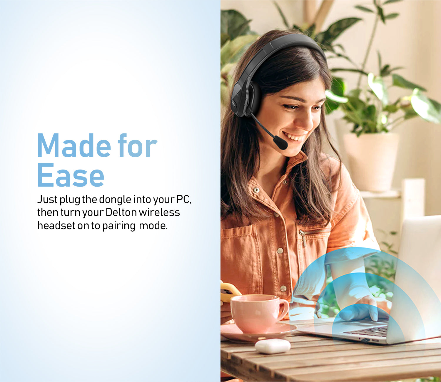 - EASY TO USE: Just plug the dongle into your PC, then turn your Delton wireless headset on to pairing mode. The headset and dongle will automatically pair! There are no complicated settings you need to work through.