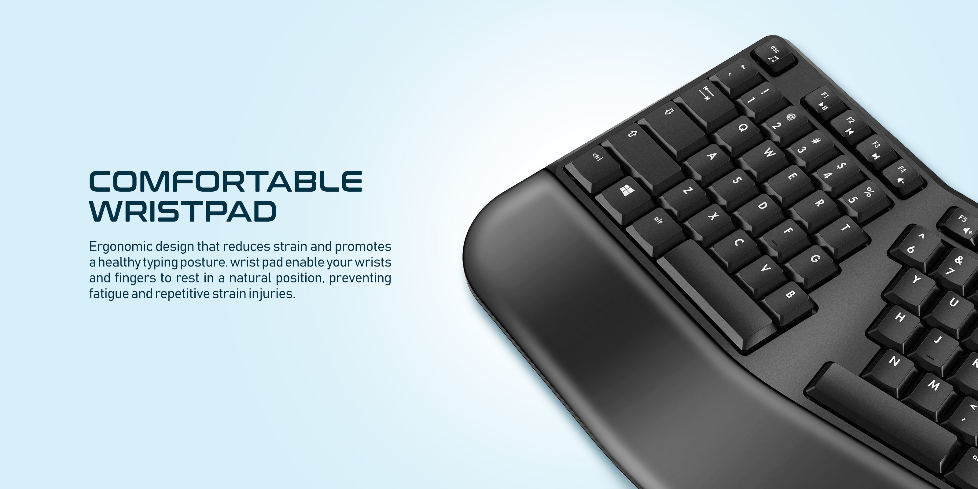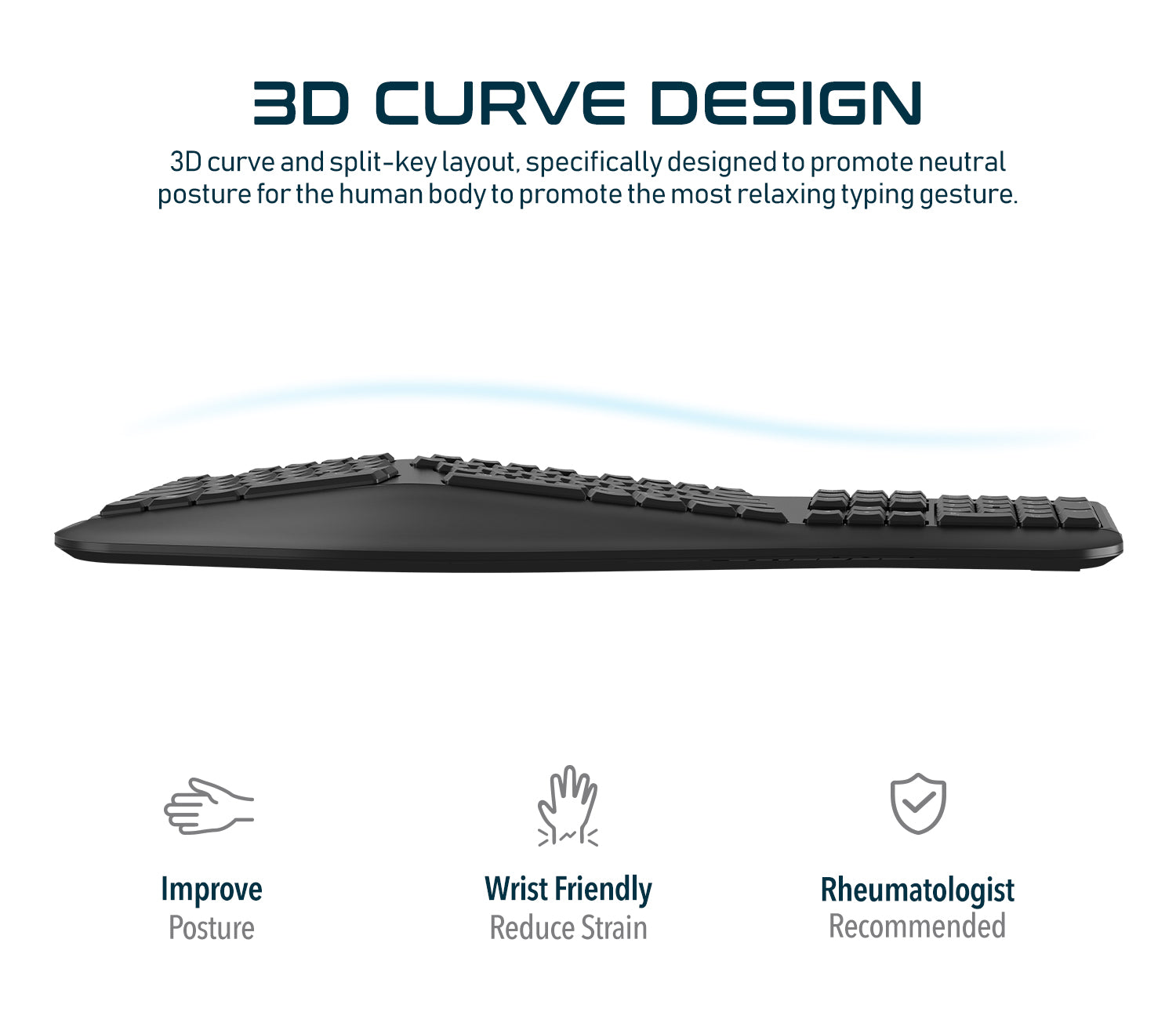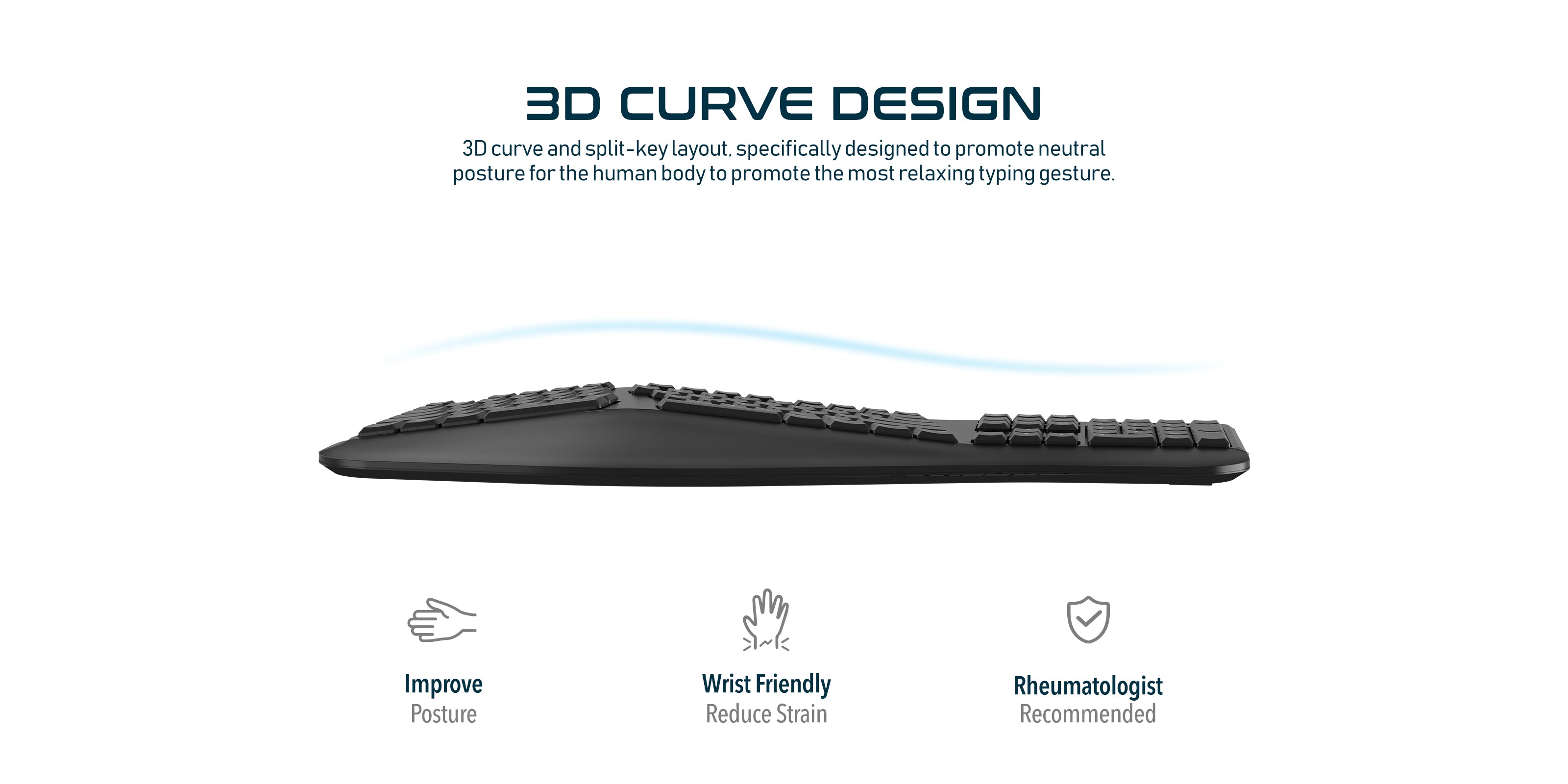 3D Curve Design: 3D curve and split-key layout, specifically designed to promote neutral posture for the human body to promote the most relaxing typing gesture.