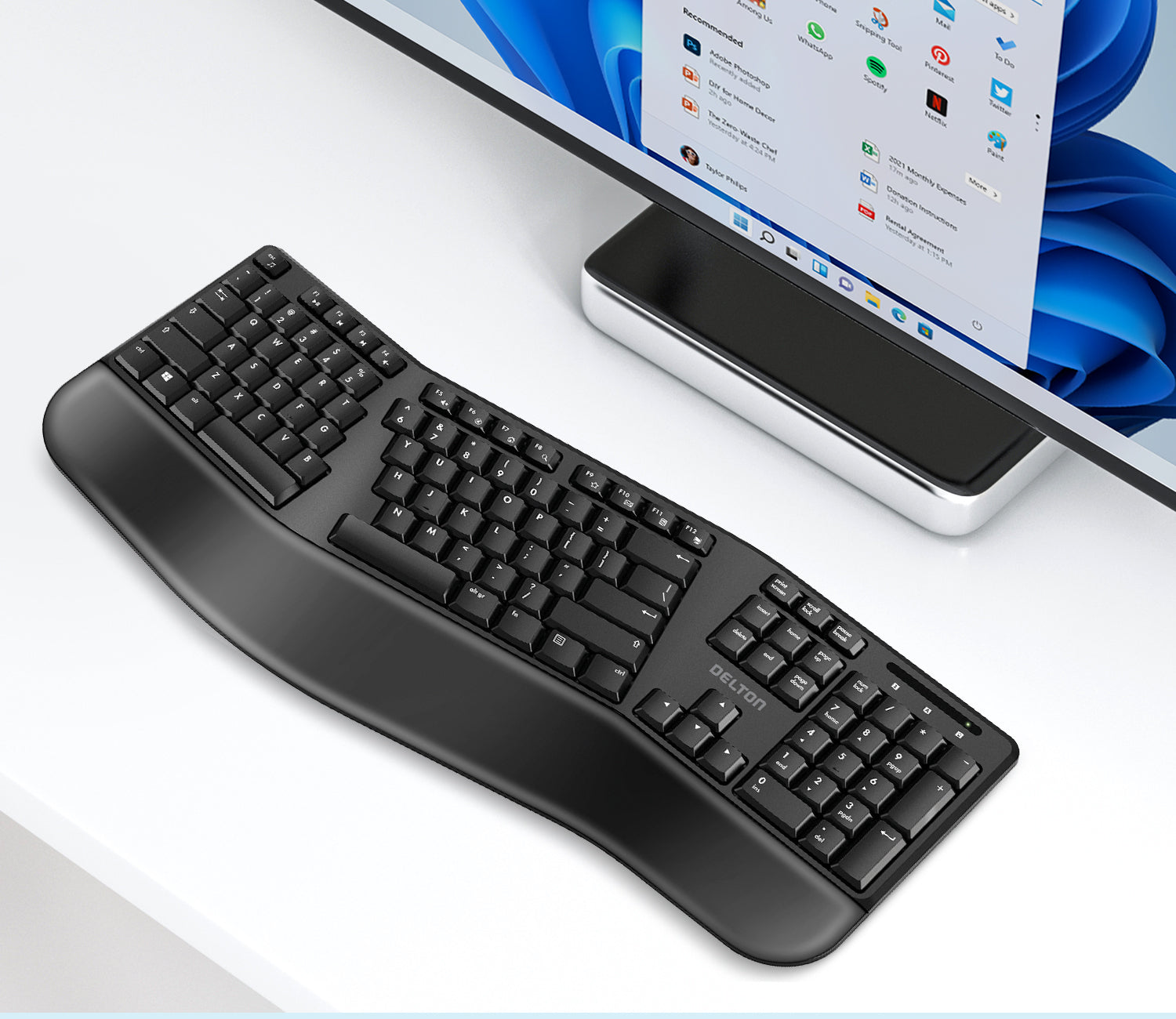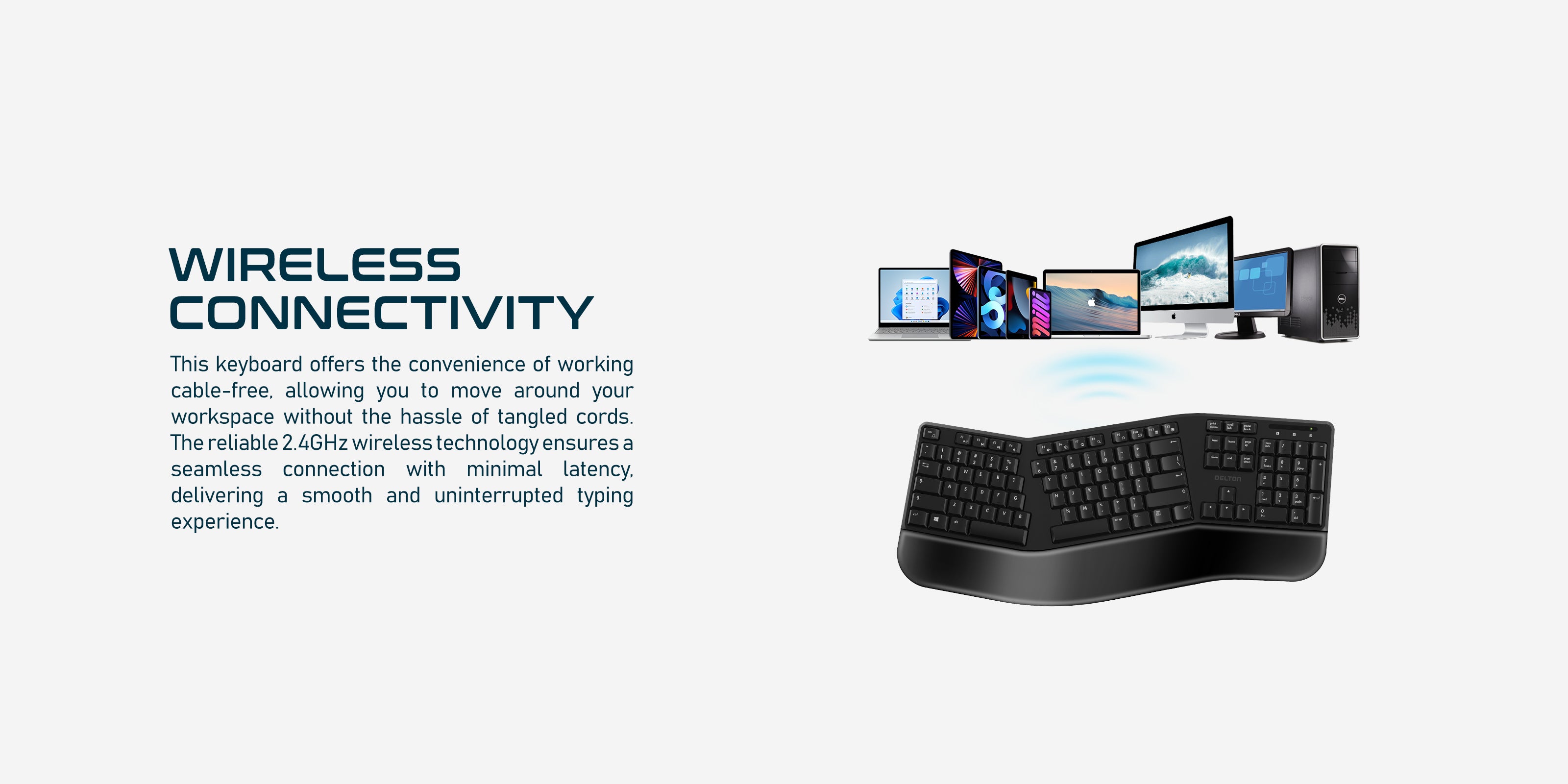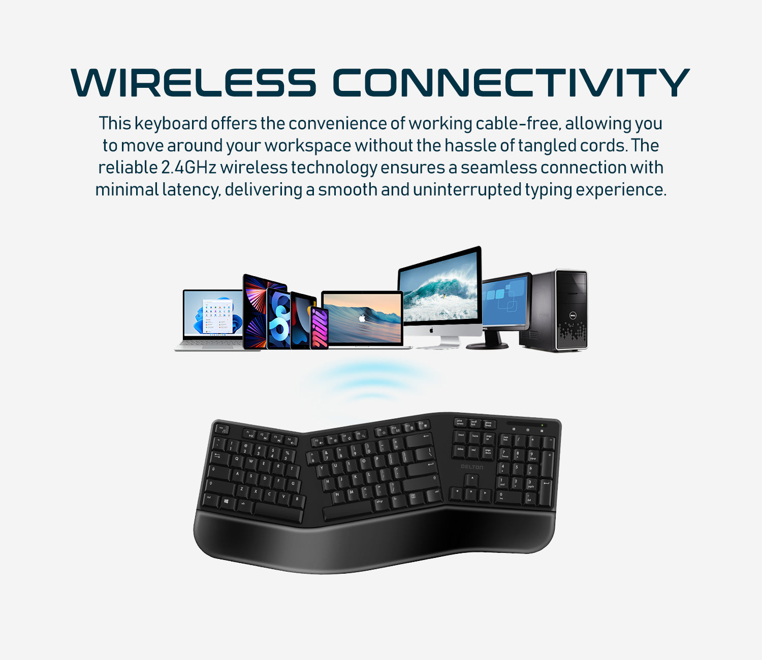 The Delton Wireless Ergonomic Keyboard blends comfort and functionality.