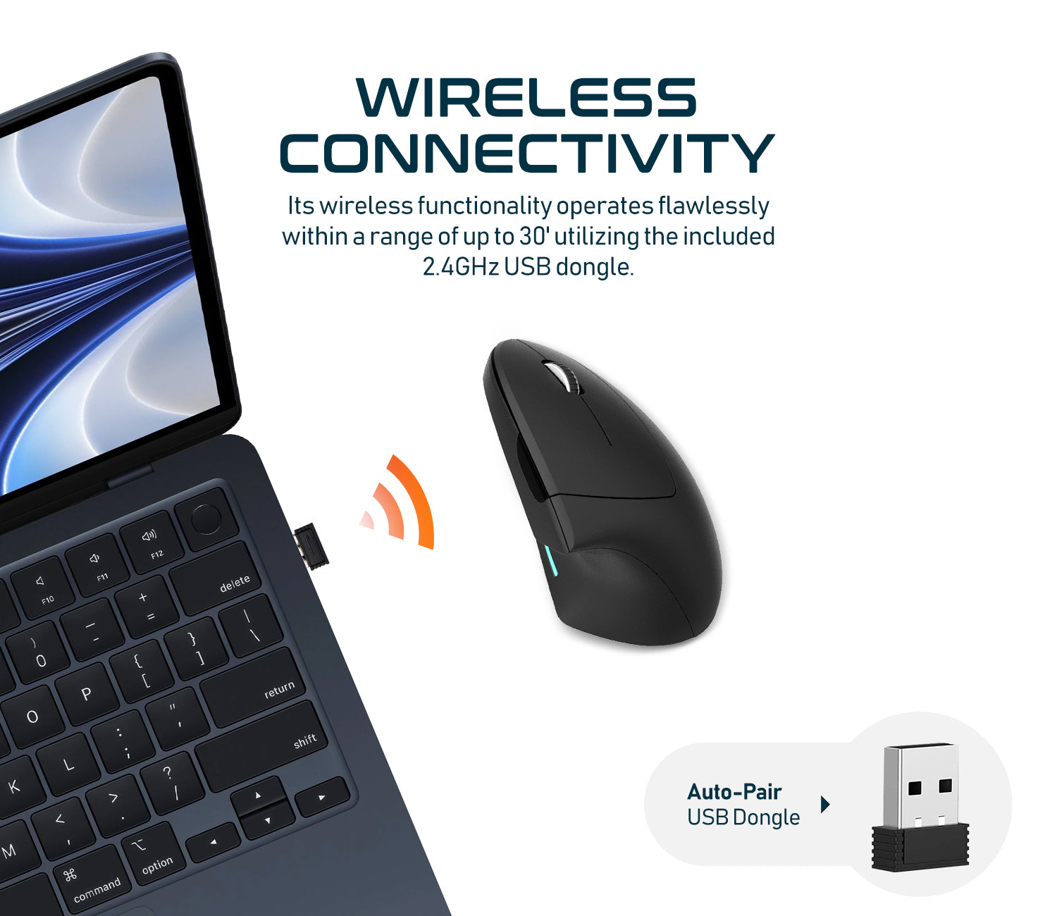 Equipped with advanced CMOS sensors, this optical mouse delivers exceptional performance for your everyday needs, whether at home, the office, or on the go. Its wireless functionality operates flawlessly within a range of up to 30' utilizing the included 2.4GHz USB dongle. Designed specifically for right-handed users, the mouse facilitates a more ergonomic wrist posture, featuring an optimally positioned thumb rest and a hand-shake arm position that alleviates strain and discomfort.